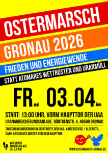 Der Gronauer Ostermarsch findet dieses Jahr direkt an der Gronauer Urananreicherungsanlage statt. Auftakt ist um 13 Uhr vor dem Haupttor der Urananreicherungsanlage Gronau, Röntgenstraße 4. Von dort gibt es einen ca. 2,5km langen Ostermarsch entlang der Anlage, Zwischenkundgebung an der Kaiserstiege/ Alsenstraße, Abschluss wieder vor dem Haupttor der Urananreicherungsanlage.